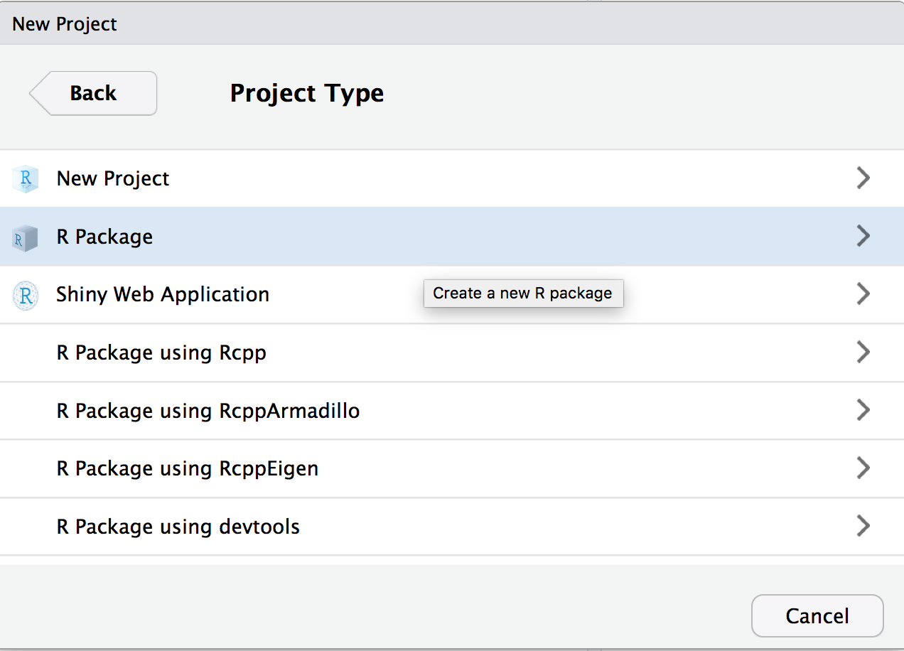 Select the project type as an R Package.