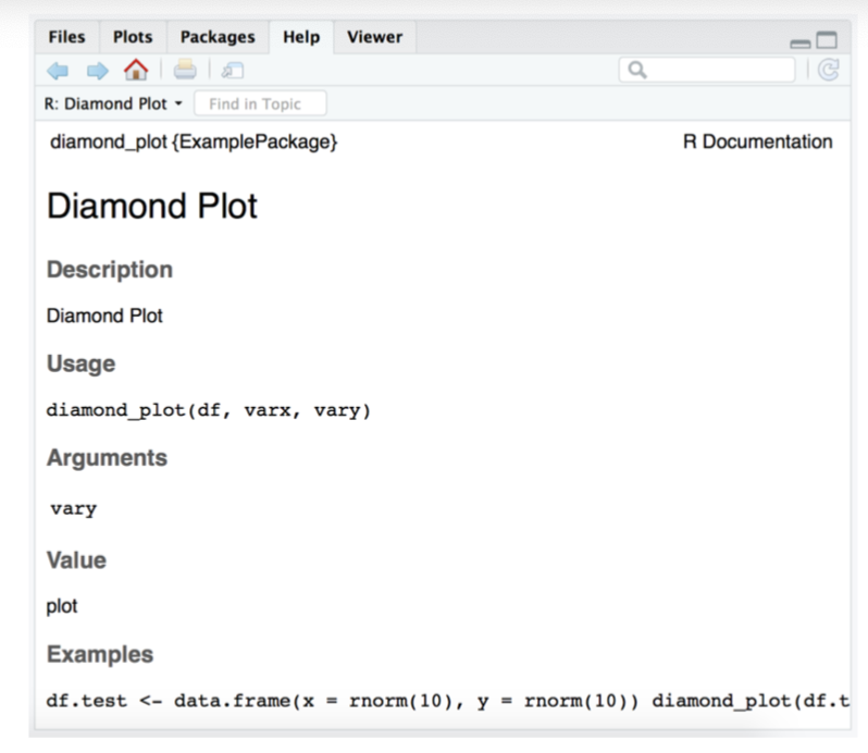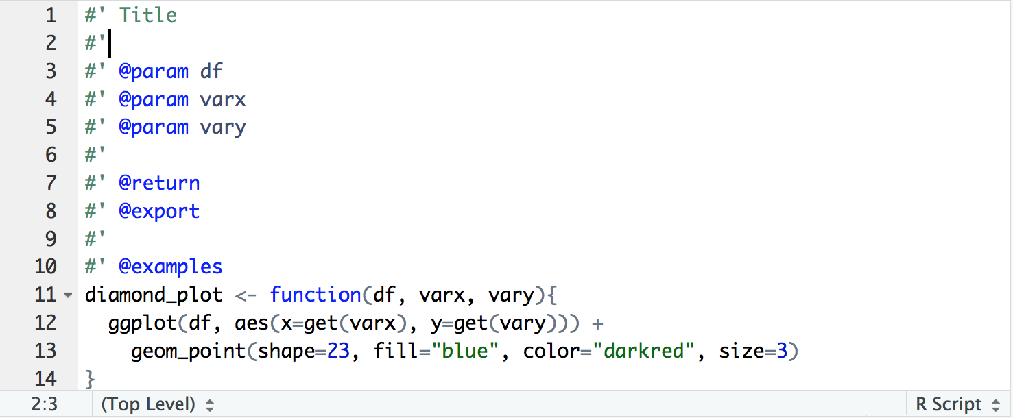 Once we are done writing the function, we will save this R Script as diamond_plot.R in the R folder of our package.