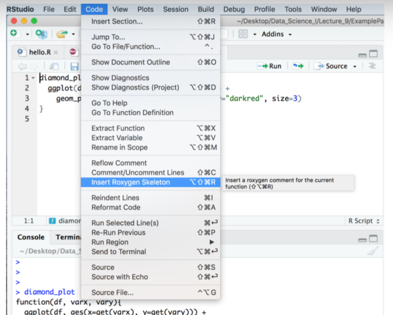 While you have the script diamond_plot.R open, go to Code >> Insert Roxygen Skeleton. Make sure your cursor is inside of the function when you do this.